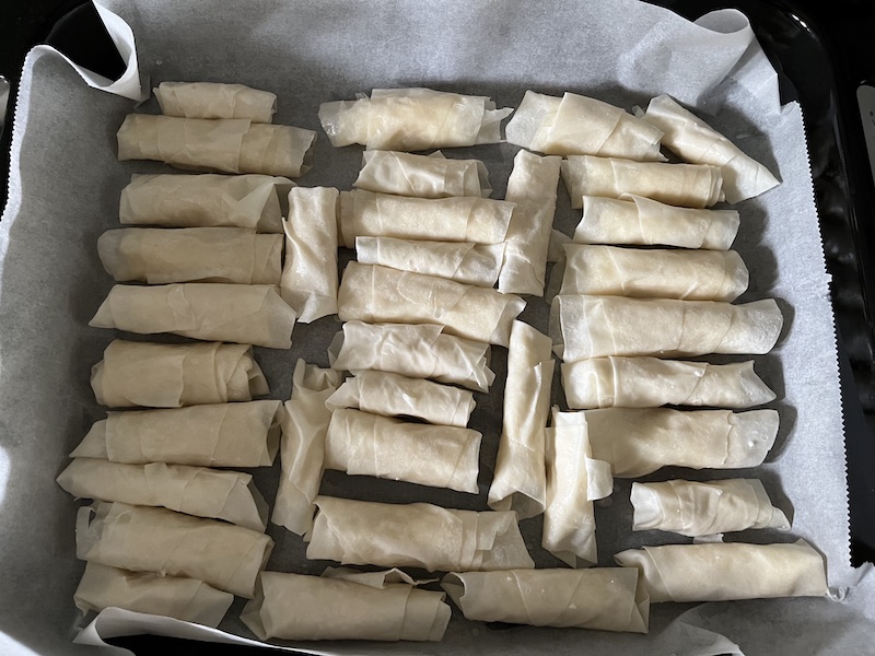 Hazırladığımız börekleri yağlı kağıt serdiğimiz fırın tepsisine diziyoruz. Toplamda 37-38 adet börek elde ediyoruz.