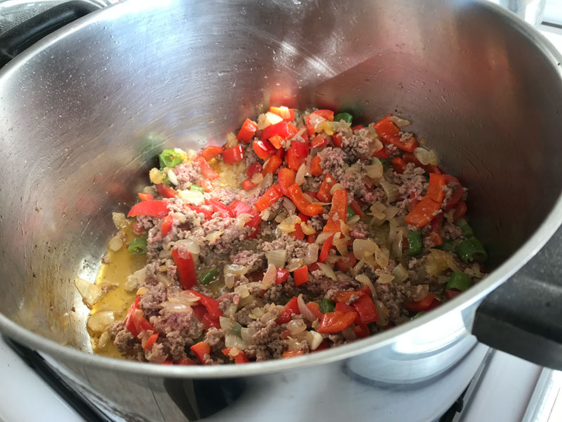 1 orta boy karnabaharı tuzlu suyla bir tencerede bütün halde haşlıyoruz ve süzüyoruz. Soğuduktan sonra dilimlere ayırıyoruz. Ayrıca yayvan bir tencerede 1 tane yemeklik doğranmış kuru soğanı, 3 adet yemeklik doğranmış yeşil sivri biberi ve 1 adet jülyen doğranmış kırmızı kapya biberi 1 çay bardağı sıvı yağ ile kavuruyoruz. Üzerine 100 gram dana kıyma ilave ediyoruz.