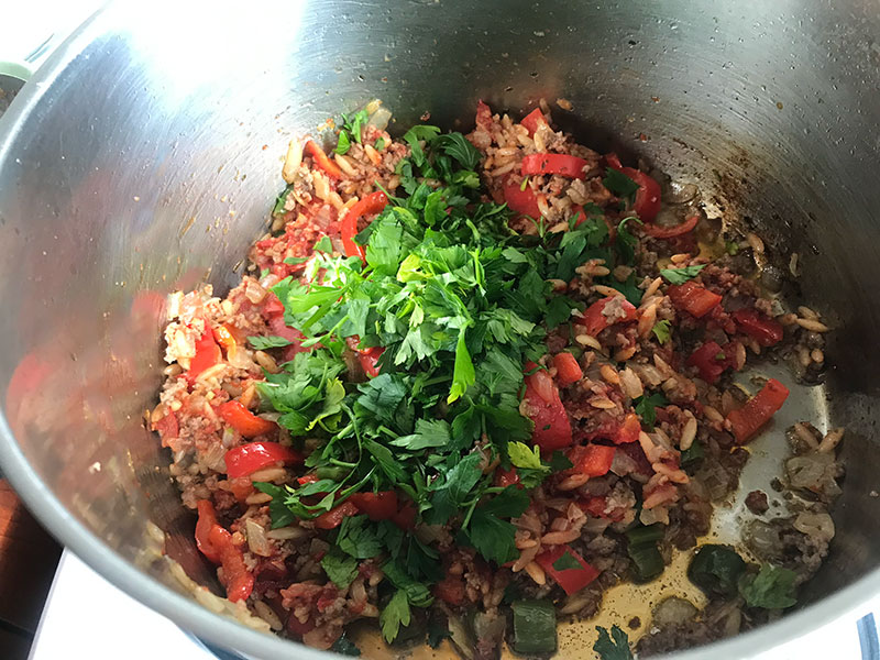 1 avuç doğranmış maydanoz ilave ediyoruz. Tüm malzemeyi karıştırıyoruz.