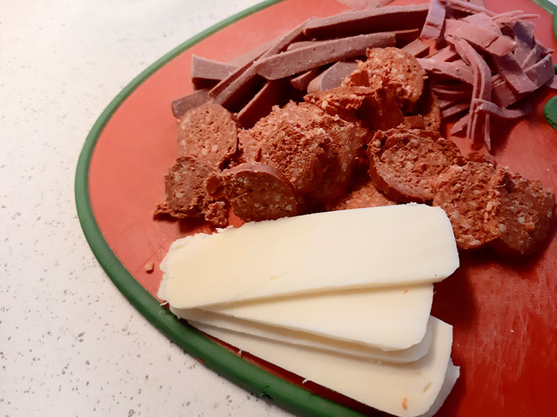 5 adet uzun sosisi jülyen şekilde doğruyoruz ve bir küçük tavada çok az sıvı yağ ile kavuruyoruz. Kavurduktan sonra bir kenara alıyoruz. Aynı tavada jülyen doğradığımız 10 dilim salamı da çok az sıvı yağ ile kavuruyoruz. Kavurduktan sonra bir kenara alıyoruz. Aynı tavada 15 dilim sucuğu da çok az sıvı yağ ile kavuruyoruz. Kavurduktan sonra bir kenara alıyoruz.