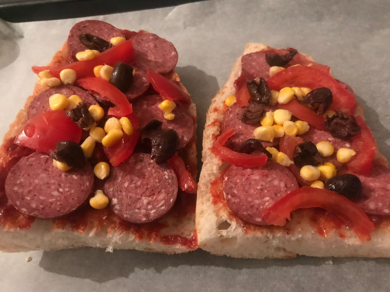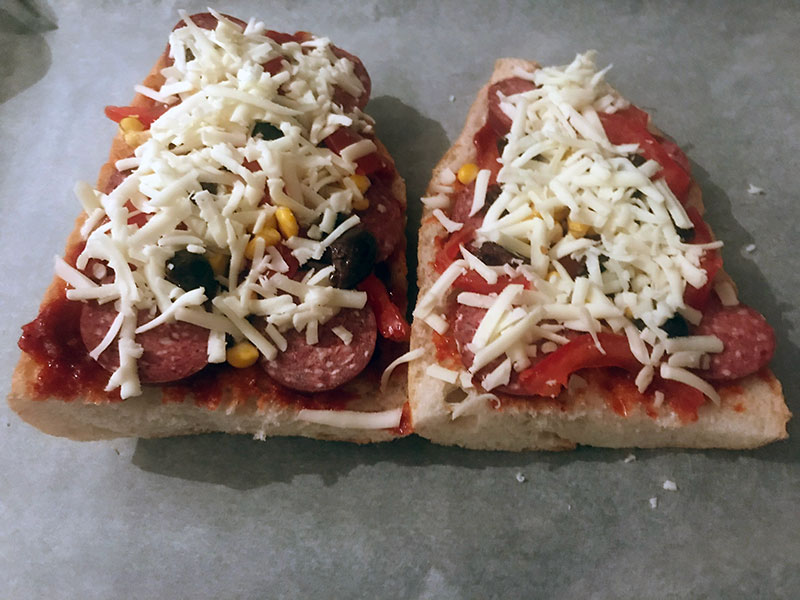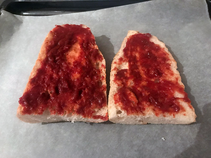 Bir bütün ekmeği ortadan ikiye bölüyoruz ve tekrar ikiye bölüyoruz. 4 adet dilim elde ediyoruz. Kestiğimiz her bir dilimin üzerine hazırladığımız salçalı sostan sürüyoruz.