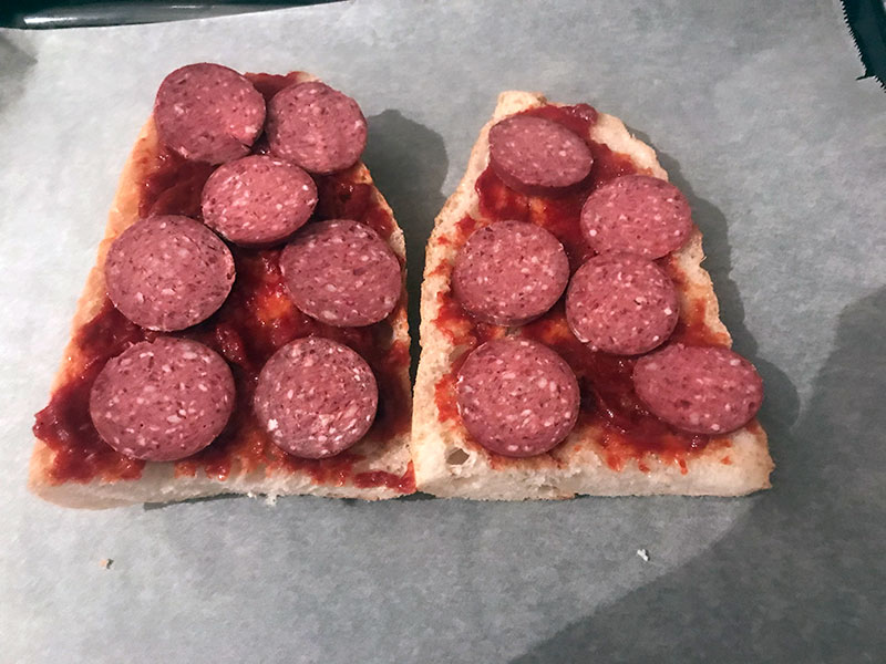 Ayrı bir kaba 20 dilim sucuk koyuyoruz. (isteğe göre çok daha az konulabilir. Biz bir dilim ekmeğe 6 dilim sucuk koyduk. Siz dilerseniz 3 dilim sucuk da koyabilirsiniz)