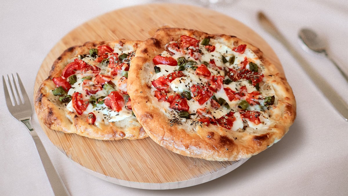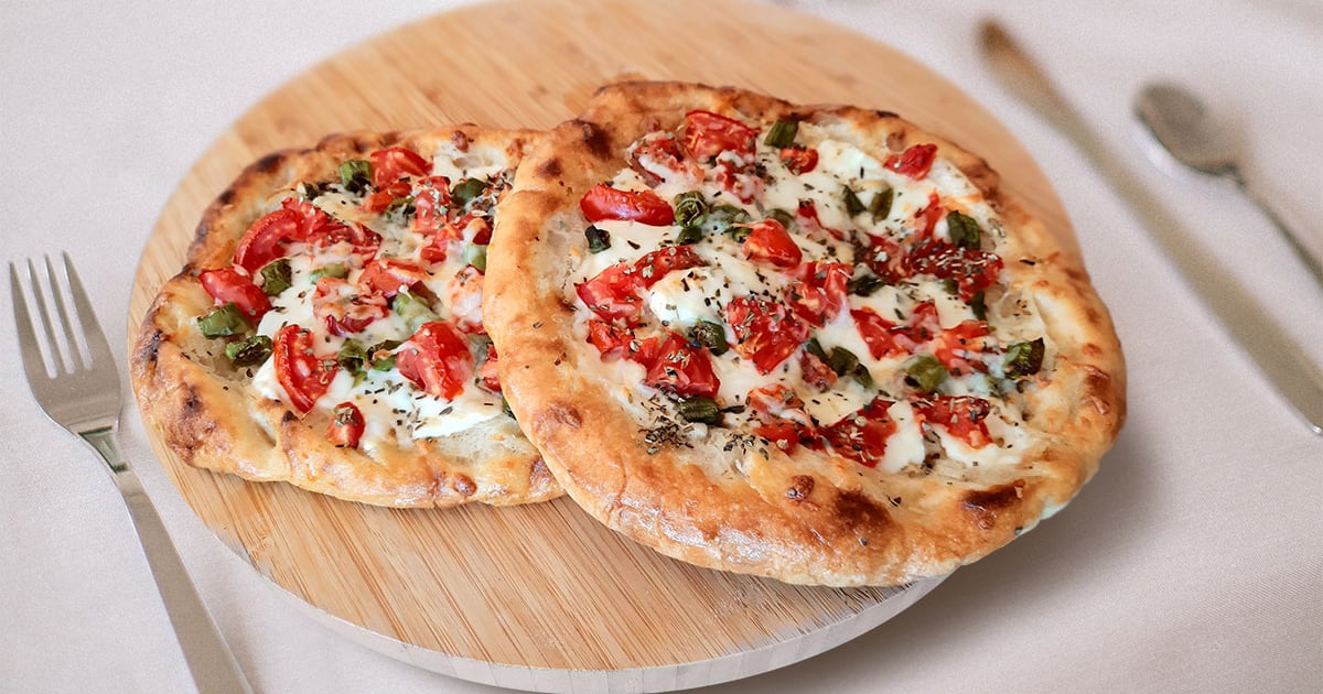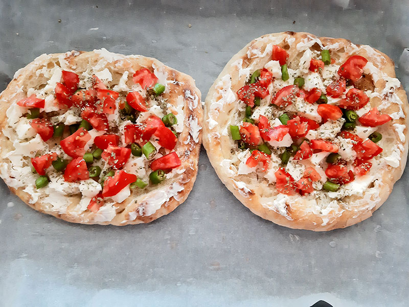 Hazırladığımız iç harcı bazlama ekmeklerinin içerisine yerleştiriyoruz. Eşit şekilde dağıtıyoruz. Yağlı kağıt serdiğimiz fırın tepsisine alarak 200 derecelik fırında kızarana kadar pişiriyoruz. Fırından çıkardıktan sonra bazlama ekmeklerinin dış kenar kısımlarına tereyağı sürüyoruz ve servis yapıyoruz. Afiyet olsun…