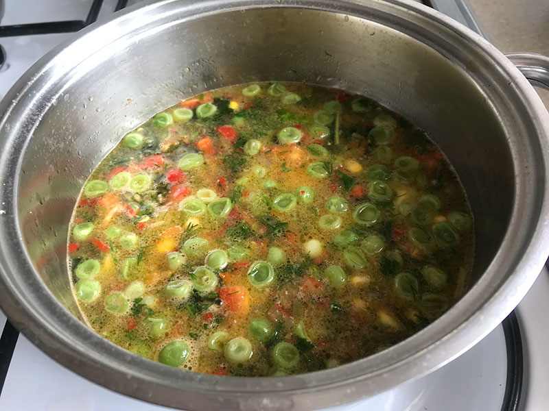 Bezelyelerin pişmesine yakın 6-7 yaprak ince ince doğranmış ıspanak ekliyoruz. 1 çay bardağı haşlanmış mısır, 1 çay bardağı arpa şehriye ve 1 çay bardağı kırılmış çubuk makarna ilave ediyoruz. 1 tatlı kaşığı tuz ve yarım çay kaşığı karabiber serpiyoruz. 1 avuç ince doğranmış dereotu ekliyoruz. Tüm malzemeyi güzelce karıştırıyoruz. Kısık ateşte pişmeye bırakıyoruz. Afiyet olsun…