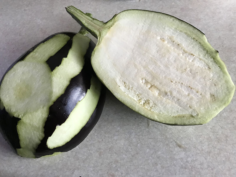 2 adet bostan patlıcanını alacalı şekilde soyuyoruz. Tuzlu suda 5-10 dakika acısı çıkması için bekletiyoruz. Sudan aldıktan sonra kuruluyoruz. Saplarıyla birlikte ortadan ikiye bölüyoruz. (Sapını koparmıyoruz) Patlıcanların alt kısımlarından biraz kesiyoruz ki kaba dizdiğimizde düzgün dursun.