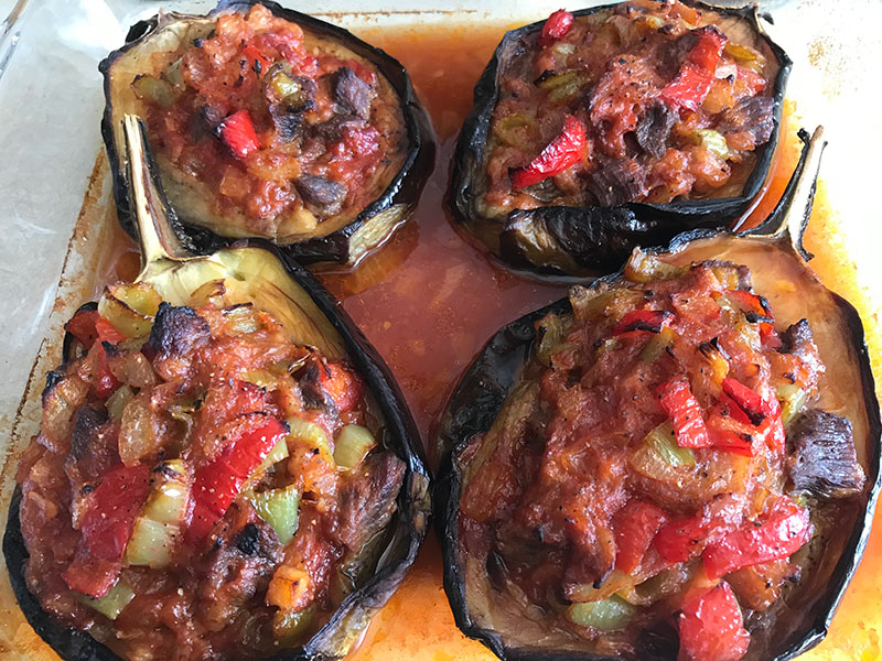 Bir tavaya 1 adet kuru soğanı, 1 adet kırmızı kapya biberi ve 3 adet yeşil sivri biberi yemeklik doğruyoruz. 1 çay bardağı sıvı yağ ile kavuruyoruz. Üzerine tencerede pişirdiğimiz etleri ilave ediyoruz. Onları da çeviriyoruz. 2 diş doğranmış sarımsak ekliyoruz ve biraz harmanlıyoruz. Kenara ayırdığımız patlıcan içlerini minik minik doğrayarak içerisine ekliyoruz. 1 tatlı kaşığı tuz ve yarım çay kaşığı karabiber serpiyoruz. Biraz çeviriyoruz. Üzerine 3 adet rendelenmiş domates ve 1 yemek kaşığı domates salçası ilave ederek karıştırıyoruz. 1 su bardağı su koyup bir taşım kaynayınca ocaktan alıyoruz.