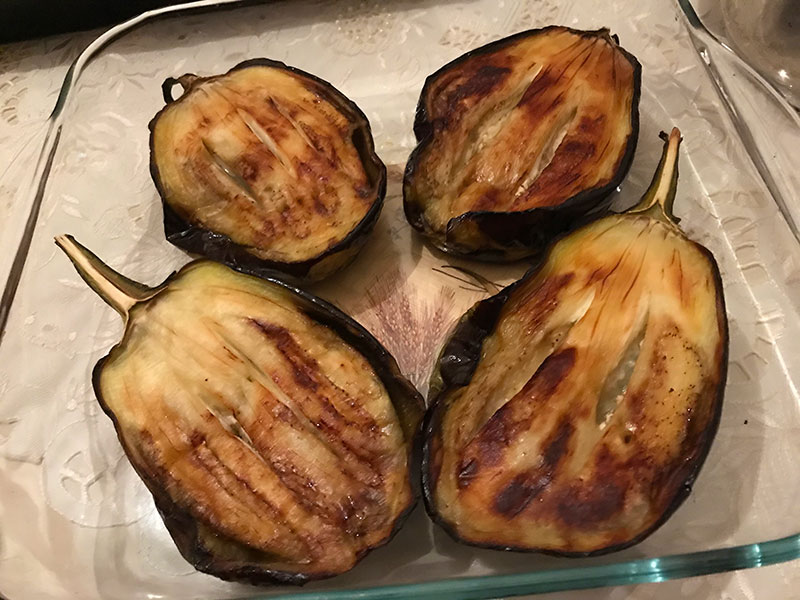 Bu şekilde kızgın yağda alt üst ederek kızartıyoruz. Kızarttığımız patlıcanları bir cam fırın kabına alıyoruz. Soğuduktan sonra iç kısımlarını biraz oyuyoruz ve oyduğumuz patlıcan içlerini atmıyoruz bir kenara alıyoruz.(kullanacağız)