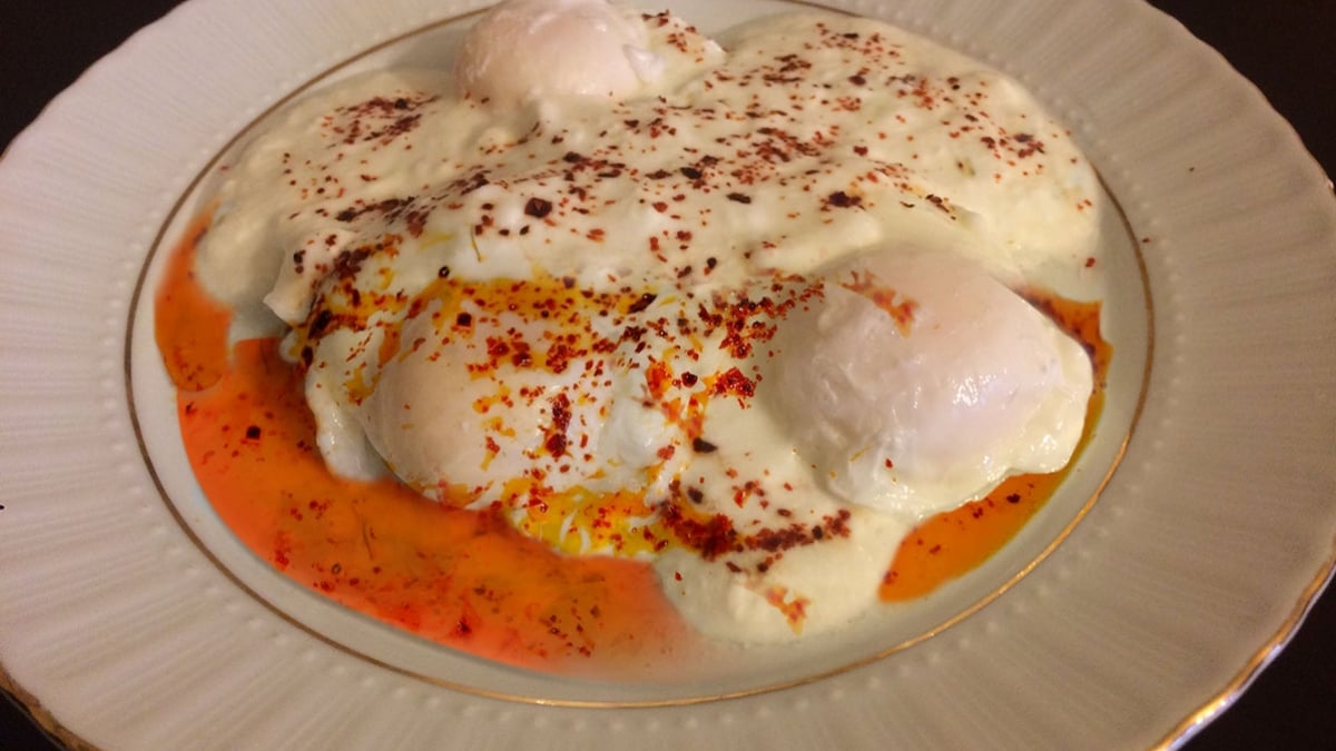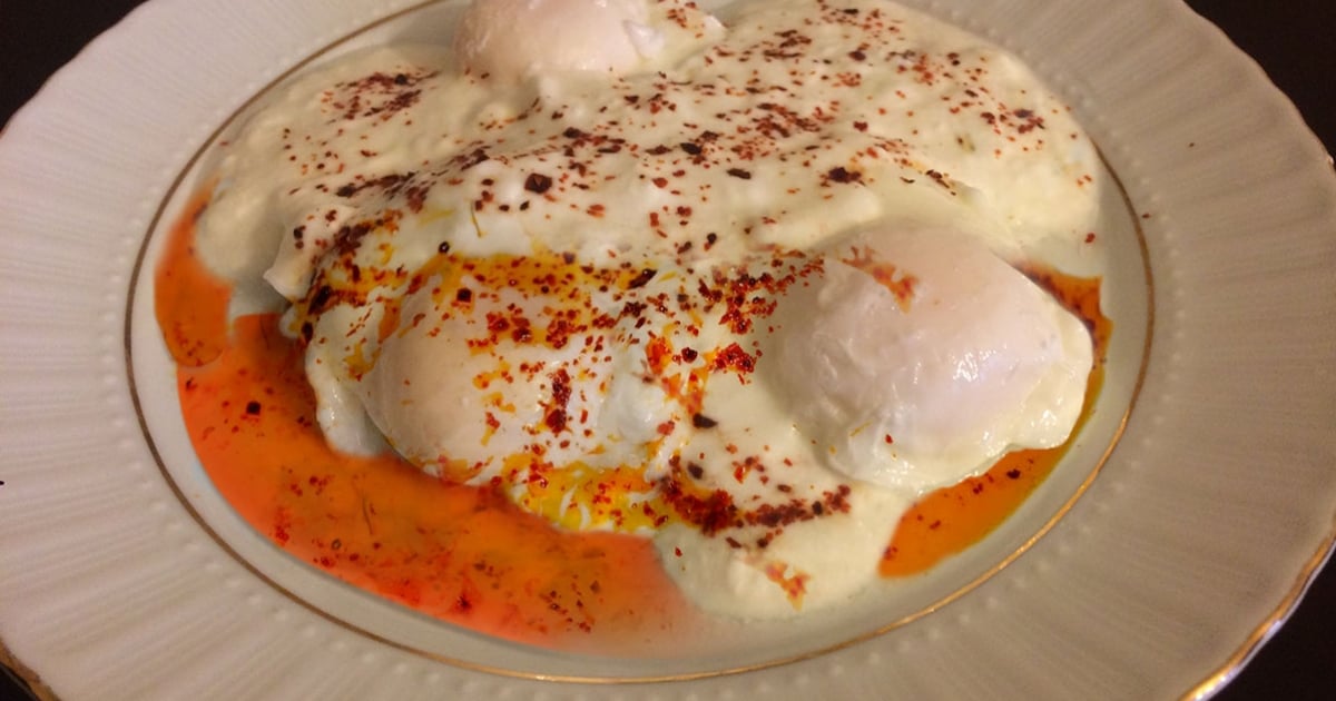 Bir orta boy tencerenin yarısına kadar su koyuyoruz. Kaynayınca içerisine 1 tatlı kaşığı üzüm sirkesi atıyoruz ve karıştırıyoruz. Karıştırırken yani tıpkı bir girdap oluştuğunda üzerine 3 tane yumurta kırıyoruz ki dağılmasın. Beyaz yerleri bembeyaz olana kadar pişiriyoruz. Aslında bunun için 3-4 dakika yeterli oluyor. Delikli süzgeç kaşık yardımıyla poşe yumurtaları içerisinden alarak servis tabağına alıyoruz. Bir kasede 3 yemek kaşığı yoğurt ile 1 diş ezilmiş sarımsağı karıştırıp yumurtaların üzerine döküyoruz ve pul biber serpiyoruz. İsteğe göre üzerine bolca nane de serpebilirsiniz...