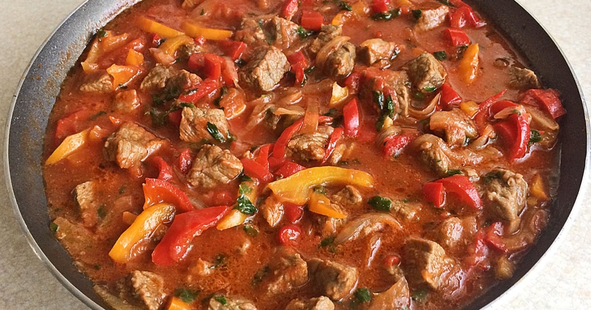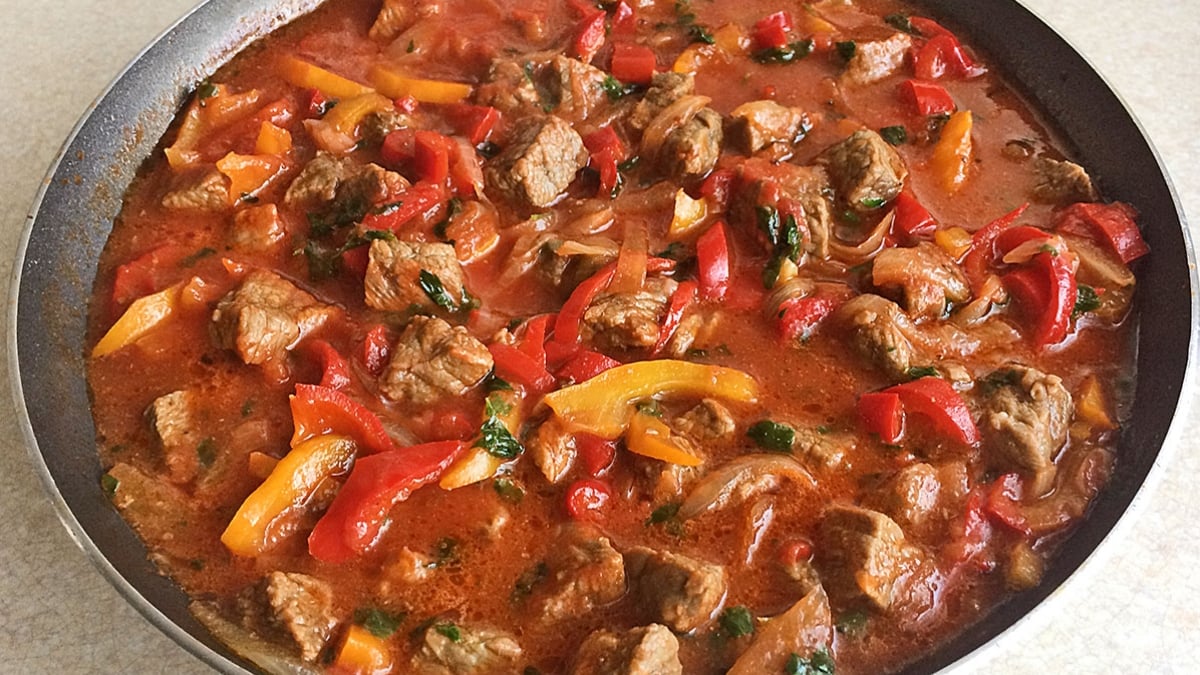 Bir tencerede küp doğranmış ve yıkanmış dana etlerini kendi suyunda pişiriyoruz. Üzerine yarım çay bardağı sıvı yağ, 1 tane jülyen doğranmış soğan, 1 tane çekirdekleri çıkartılmış kırmızı biber ve 1 tane çekirdekleri çıkartılmış sarı dolmalık biber ekleyip hepsini kavuruyoruz. 4 tane küp doğranmış domates ilave ediyoruz ve çeviriyoruz. Üzerine yarım çay bardağı su, 1 avuç doğranmış maydanoz, 1 çay kaşığı pulbiber ve 1 tatlı kaşığı tuz ilave edip pişiriyoruz. Afiyet olsun…