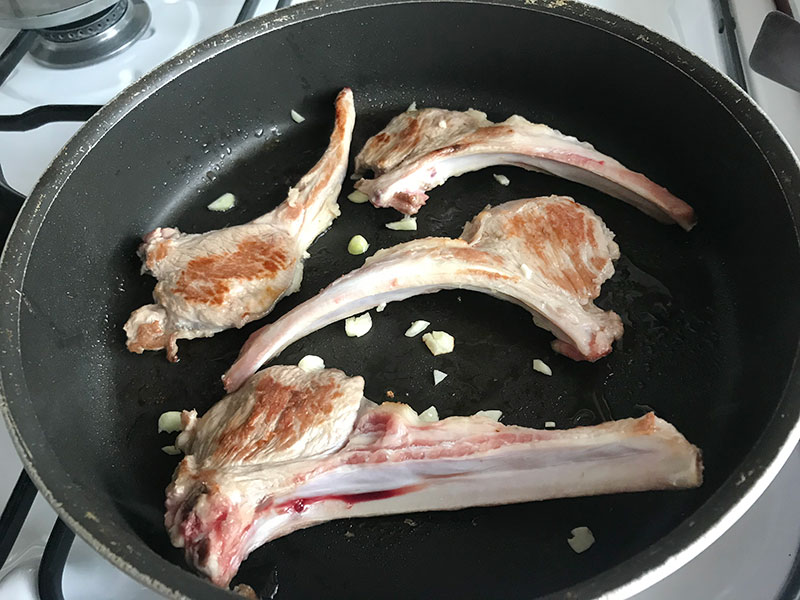 Bir pilav tenceresine 4 kalem pirzola koyuyoruz. 1 diş minik doğranmış sarımsak ilave ediyoruz. 1 yemek kaşığı sıvı yağ gezdirip pirzolaları alt üst ederek kızartıyoruz.
