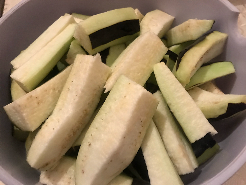 5 adet zebra şeklinde soyarak tuzlu suda 10 dakika bekletip sıktığımız ve parmak şeklinde doğradığımız patlıcanları sıvı yağ ile güzelce yağladıktan sonra yağlı kağıt serdiğimiz fırın tepsisine diziyoruz ve 200 derecelik fırında kızartıyoruz.