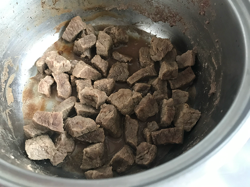 250 gram dana kuşbaşı eti yıkayıp bir tencereye alıyoruz. Etleri kendi suyunda kısık ateşte pişiriyoruz.