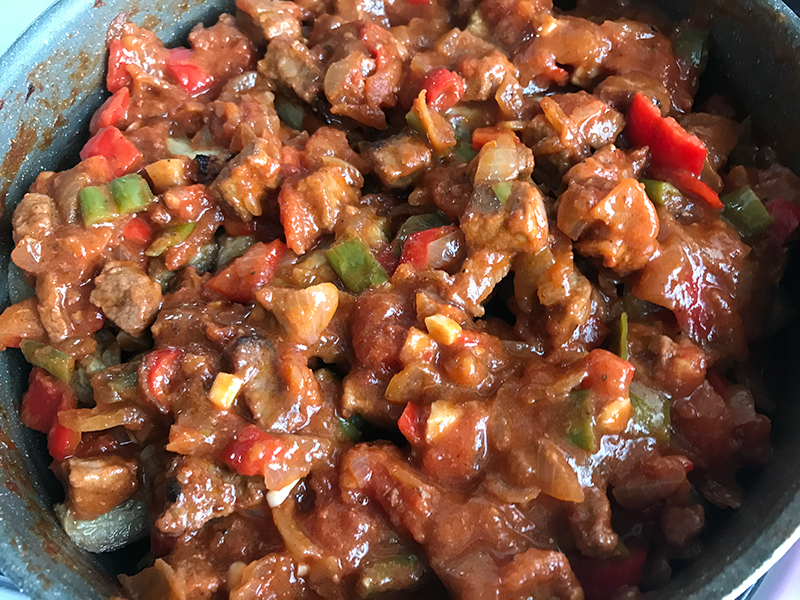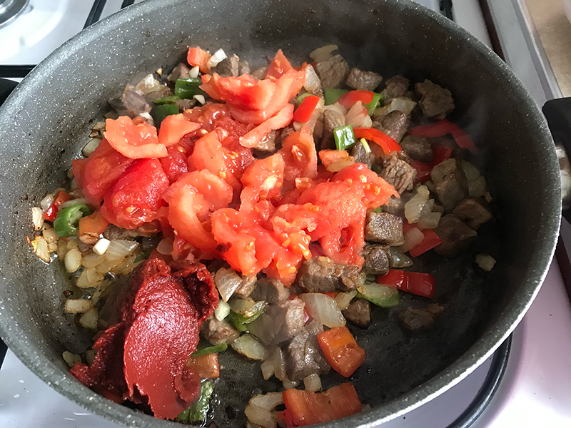 Üzerine yarım çay bardağı sıvı yağ, 1 adet yemeklik doğranmış kuru soğan, 1 adet kırmızı kapya biber ve 2 adet yemeklik doğranmış sivri biber ekleyip tüm malzemeyi güzelce kavuruyoruz. 2 diş minik minik doğranmış sarımsak ilave edip onu da biraz çeviriyoruz. Üzerine 2 adet kabukları soyulmuş ve yemeklik doğranmış domates, 1 yemek kaşığı domates salçası ve 1 tatlı kaşığı tuz, yarım çay kaşığı karabiber ekleyip onu da biraz çeviriyoruz ve ocaktan alıyoruz.