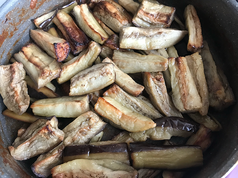Bir pilav tenceresine fırında kızarttığımız patlıcanları yerleştiriyoruz.
