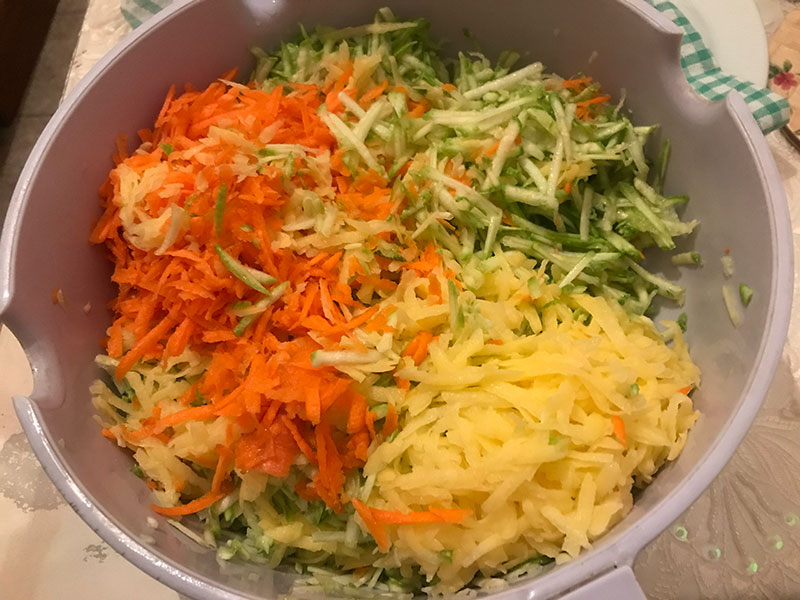 Bir kaba ayıklanmış ve yıkanmış 1 adet kabak reboy ndeliyoruz. 1 adet havuç rendeliyoruz ve 1 büyük patates rendeliyoruz. Üzerine 1 adet orta boy kuru soğanı ince ince yemeklik doğruyoruz.