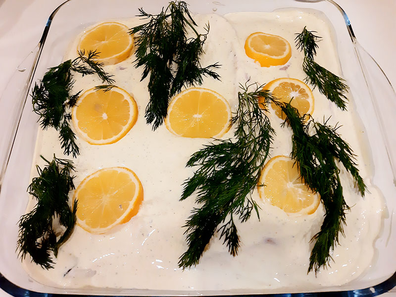 Süzülen somonları bir cam fırın kabına yerleştiriyoruz. Hazırladığımız sosu somonların üzerlerine döküyoruz ve açıklık kalmayacak şekilde iyice yayıyoruz. (Üzerleri kaplanacak) Sosun üzerine 1 adet limonu dilim dilim keserek koyuyoruz ve 4 dal yıkadığımız dereotunu da yerleştiriyoruz. 200 derecelik fırında yaklaşık 40-45 dakika pişiriyoruz. Sıcak servis yapıyoruz. Afiyet olsun…