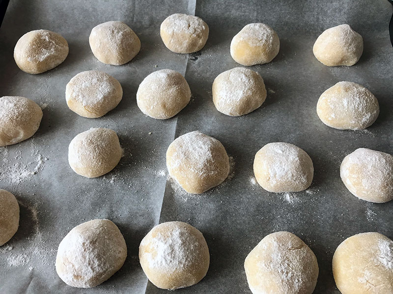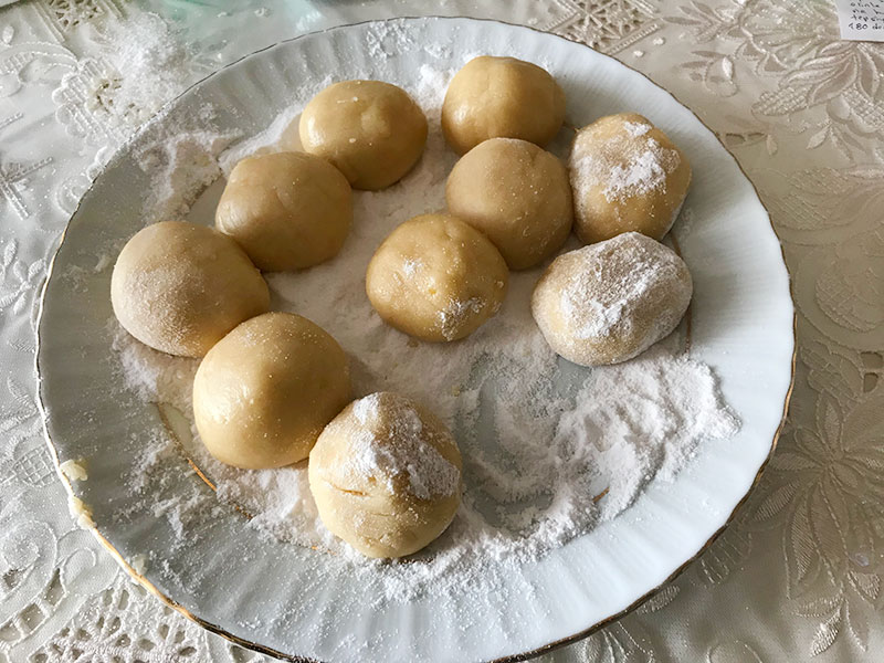 Hazırladığımız malzemeden kaşık yardımıyla elimize ceviz büyüklüğünde parçalar alarak yuvarlıyoruz ve pudra şekerinin içerisine koyup yuvarlıyoruz.