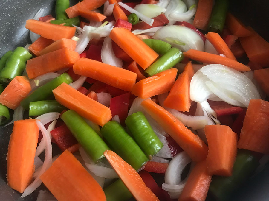 Bir tencereye 1 yemek kaşığı sıvı yağ ve 1 çay bardağı zeytinyağı döküyoruz. 1 adet kuru soğanı jülyen şekilde doğruyoruz. 1 adet havucu soyduktan sonra uzun uzun doğruyoruz. 1 adet kapya biberi jülyen şekilde doğruyoruz. 2 adet yeşil sivri biberi de uzun uzun doğradıktan sonra tüm malzemeyi güzelce kavuruyoruz.