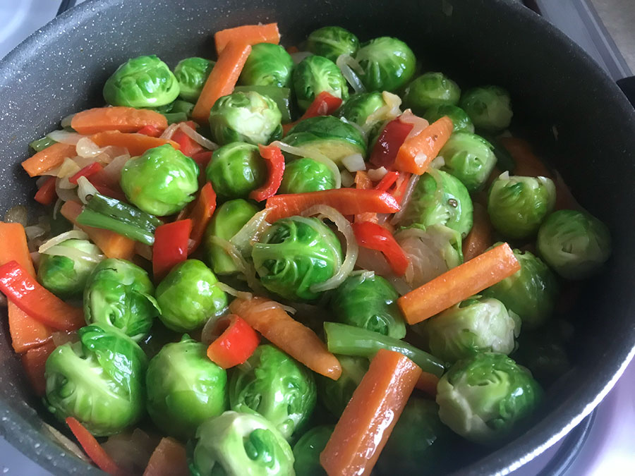 Soğanlar pembeleşince içerisine 2 adet minik minik doğranmış sarımsak ilave ediiyoruz ve biraz çeviriyoruz. Yarım kilo yıkanmış brüksel lahanalarını üzerine ekliyoruz ve onları da biraz çeviriyoruz.