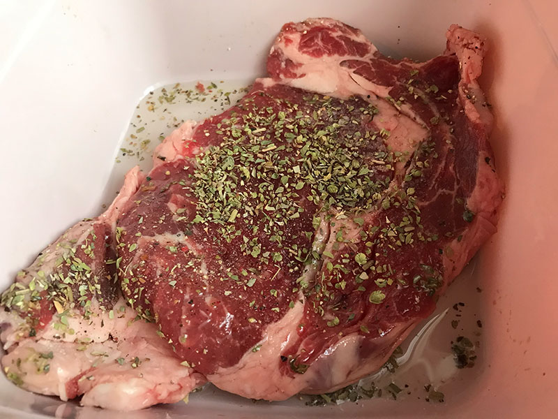 1 dilim antrikot etini bir kaba alıyoruz. Üzerine 2 yemek kaşığı sıvı yağ gezdiriyoruz. Üzerine yarım tatlı kaşığı kekik ve yarım çay kaşığı tuz serpiyoruz ve güzelce harmanlıyoruz. Bu şekilde marine olması için 30 dakika bekletiyoruz.