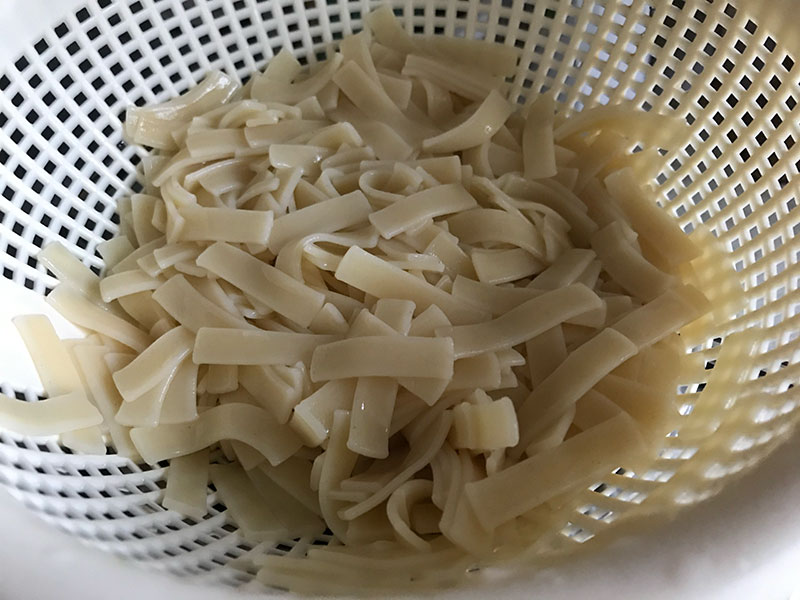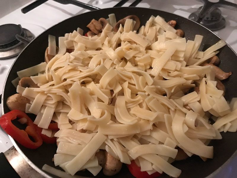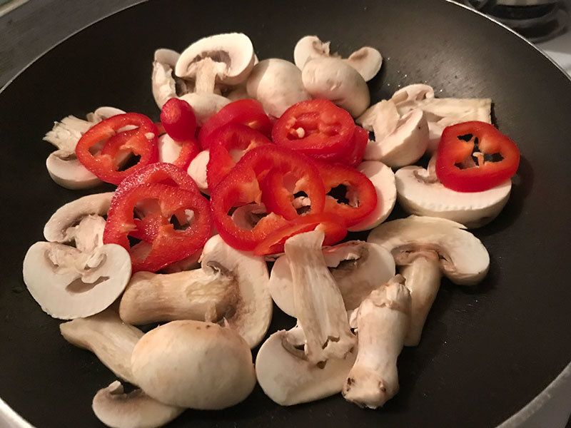 Erişteler haşlanırken geniş bir tavada 10 adet iri doğranmış kültür mantarı, 1 adet yuvarlak doğranmış kapya biberi yarım çay bardağı sıvı yağ ile kavuruyoruz. Üzerine minik doğranmış 1 diş sarımsak ekliyoruz ve onu da biraz çeviriyoruz ve ocaktan alıyoruz.