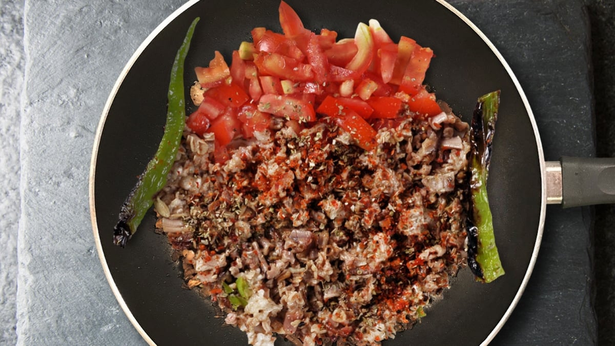 Tavaya 1 yemek kaşığı sıvı yağ ekleyip ocağın altını açarak küp küp doğranmış 2 tane domates ve 5 tane sivri biberi ekliyoruz. Domates ve biberler piştikten, suyunu da çektikten sonra kokoreçleri ekliyoruz ve biraz daha kavuruyoruz. 1 tatlı kaşığı kekik, 1 çay kaşığı pul biber, 1 tatlı kaşığı tuz attıktan sonra ocaktan alıyoruz.