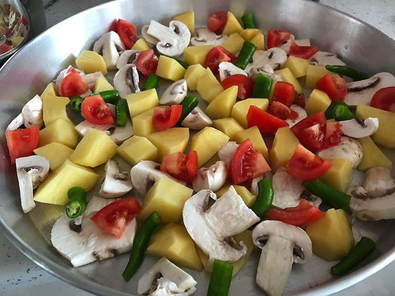 Bir fırın tepsisine yıkadığımız 10 adet kültür mantarını iri iri doğruyoruz. 2 adet patatesi de soyduktan sonra küp küp doğruyoruz. 5 adet sivri biberi iri iri doğruyoruz. 2 adet domatesi küçük küçük doğruyoruz.
