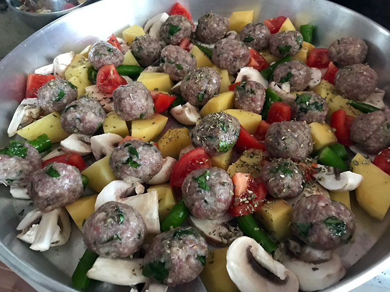 Tüm malzemenin üzerine 1 tatlı kaşığı tuz gezdiriyoruz. Malzemelerin üzerine hazırladığımız köfteleri ilave ediyoruz. Üzerine 1 tatlı kaşığı kekik serpiyoruz.
