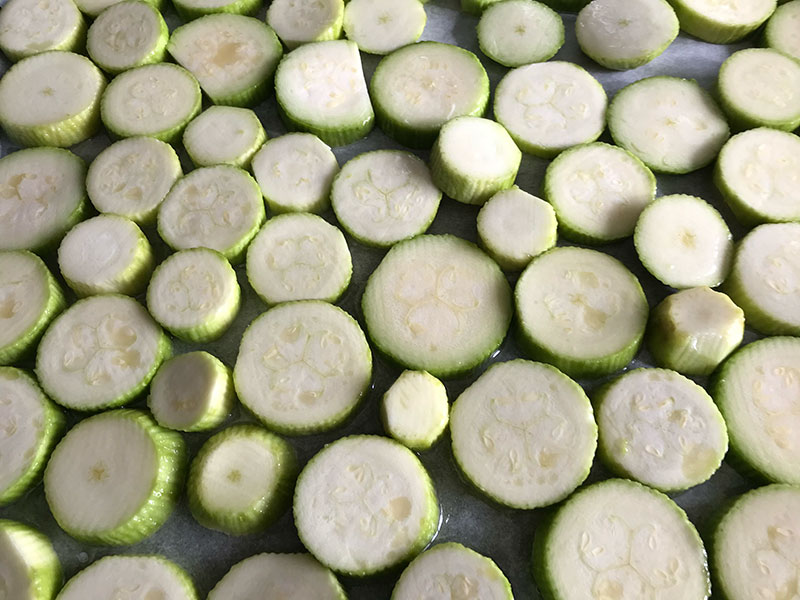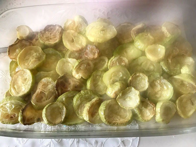 5 adet kabağı yuvarlak yuvarlak doğruyoruz. Bir kabın içerisinde sıvı yağ ile güzelce yağladıktan sonra yağlı kağıt serdiğimiz fırın tepsisine diziyoruz. 200 derecelik fırında kızartıyoruz.