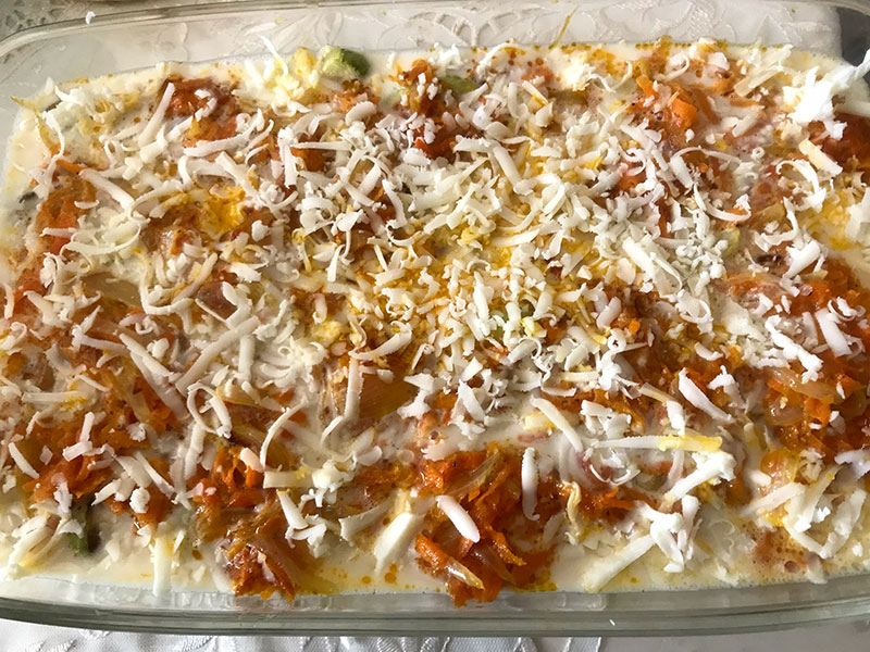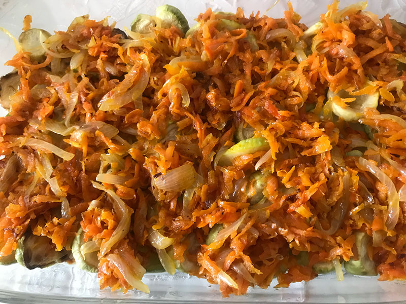 Bir kare fırın borcama önce kızarttığımız kabakları diziyoruz. Üzerine hazırladığımız soğan ve havuçlu harcı yayıyoruz.