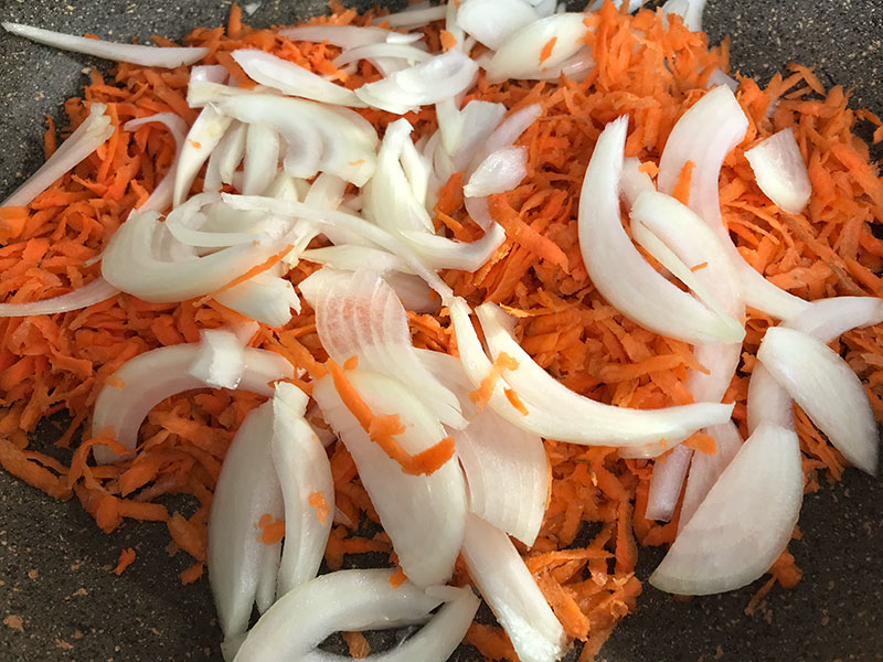 Bir tavada 1 adet jülyen doğranmış kuru soğan ve 2 adet rendelenmiş havucu yarım çay bardağı sıvı yağ ile kavuruyoruz. 1 çay kaşığı tuz serpiyoruz ve iyice kavurup ocaktan alıyoruz.