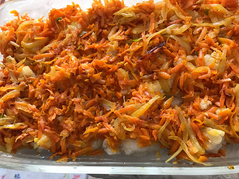 Bir kare fırın borcama önce çiçek çiçek ayırdığımız karnabaharları diziyoruz. Üzerine hazırladığımız soğan ve havuçlu harcı yayıyoruz.