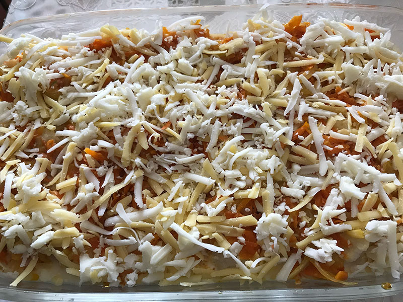 Üzerine hazırladığımız sosu her yerine gelecek şekilde gezdiriyoruz. Üzerine 50 gram rendelenmiş kaşar peyniri serpiyoruz.