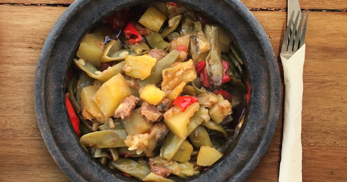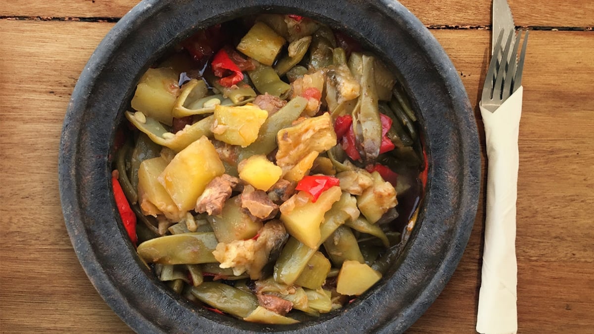 1 tane soğanı temizleyip küp şeklinde doğruyoruz. Taze fasulyelerin kılçıklarını temizleyip doğruyoruz. 1 tane patlıcanı soyup küp şeklinde doğruyoruz, kararmamaları için tuzlu suda 10 dakika bekletiyoruz. 1 kırmızı biber ve 2 sivri biberi temizleyip doğruyoruz. 1 tane kabak, 2 tane patates ve 3 tane domatesi soyup küp şeklinde doğruyoruz. Derin bir güvecin tabanını 1 tatlı kaşığı sıvı yağla yağlıyoruz ve etleri yayıyoruz. Üzerlerine sırasıyla doğradığımız patates, fasulye, patlıcan, biber, kabak, soğan ve domatesleri ilave ediyoruz.