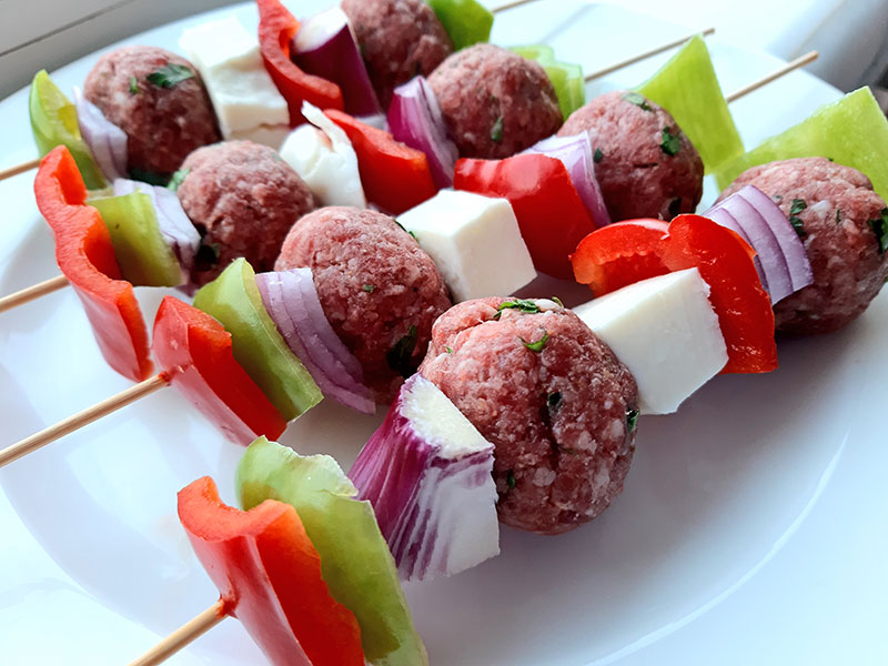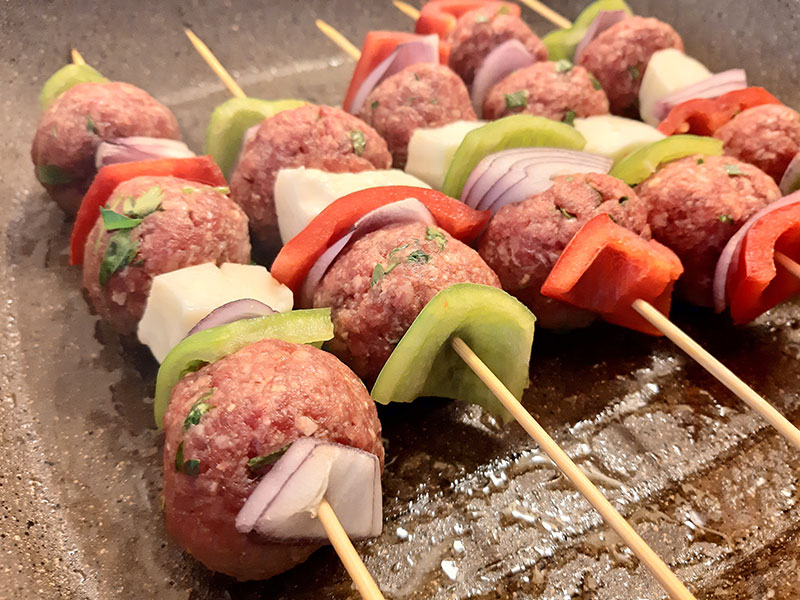 Izgara yapacağımız tahta şişe önce hazırladığımız yeşil biberden 1 adet geçiriyoruz. Kırmızı soğandan geçiriyoruz. 1 adet köfte geçiriyoruz. Hellim peynirinden de geçiriyoruz. Tekrar soğan ve biberlerden geçirip tekrar köfte geçiriyoruz ve tekrar biber geçiriyoruz.