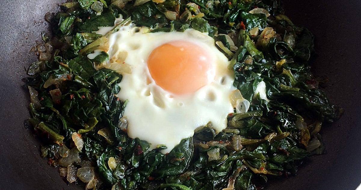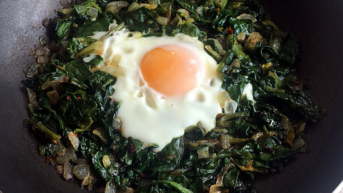 8 yaprak ıspanağı yıkıyoruz ve ince ince (sapları da dahil) doğruyoruz. Bir tavada 1 tane yemeklik doğranmış soğanı yarım çay bardağı sıvı yağ ile kavuruyoruz. Üzerine ıspanakları ilave ediyoruz. 1 çay kaşığı tuz, yarım çay kaşığı karabiber, 1 çay kaşığı pulbiber ilave edip kavuruyoruz. Ispanağın ortasını açıp 1 tane yumurta kırıp kapağını kapatıyoruz ve yumurta pişince ocaktan alıyoruz.