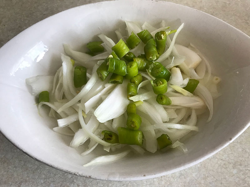 Ayrı bir kaba 1 adet kuru soğanı piyazlık olarak doğruyoruz. Doğradığımız soğanları elimizle biraz ovuyoruz. Ovduktan sonra 3 diş ince doğranmış sarımsak ve 3 adet küçük küçük doğranmış sivri biber ilave ediyoruz.