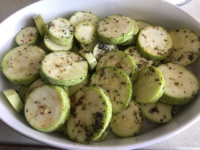 4 adet kabağın baş kısımları kesip soymadan bir kaba halka halka doğruyoruz. Üzerine 1 çay bardağı sıvı yağ döküyoruz. 1 tatlı kaşığı tuz, 1 tatlı kaşığı kuru nane, yarım tatlı kaşığı karabiber ve 1 çay kaşığı pul biber serpiyoruz. Tüm malzemeyi güzelce harmanlıyoruz.