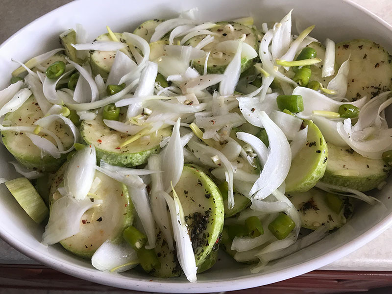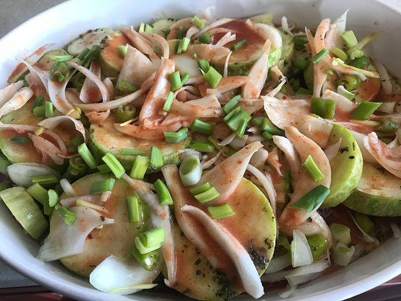 Hazırladığımız kabakları fırın kabına döküyoruz. Üzerine hazırladığımız soğanlı malzemeyi döküyoruz. Üzerine 2 adet taze soğan doğruyoruz.