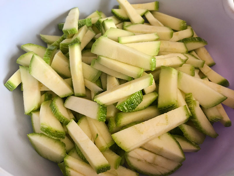 Bir tencereye 1 adet kuru soğanı ve 3 adet yeşil sivri biberi yemeklik doğruyoruz. Yarım çay bardağı sıvı yağ ile birlikte biraz kavuruyoruz. Üzerine yarım yemek kaşığı domates salçası ilave ediyoruz ve biraz çeviriyoruz. Üzerine 2 adet rendelenmiş domates ekliyoruz ve onu da biraz çeviriyoruz. Üzerine doğradığımız yeşil kabakları ilave ediyoruz.