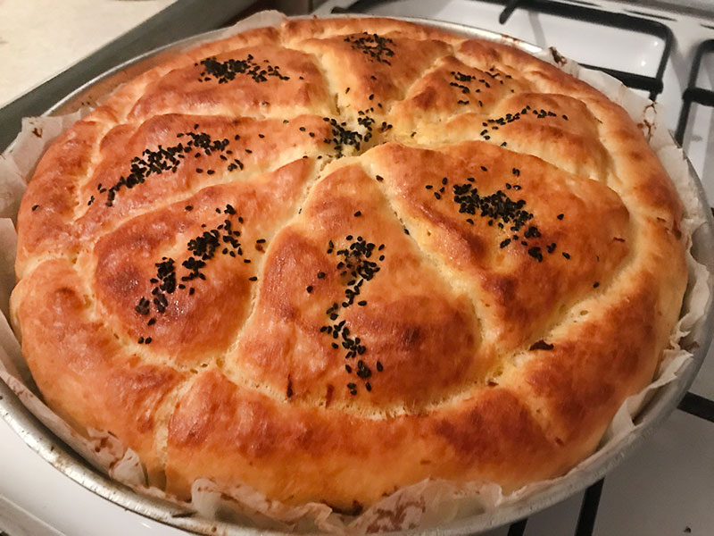 Hamur 1 saat mayalandıktan sonra tezgah üzerine biraz un serpiyoruz ve hamuru alıp gazının çıkması için biraz daha yoğuruyoruz. Yağlı kağıt serdiğimiz yuvarlak fırın tepsisine hamurumuzu alıyoruz. Hazırladığımız karışıma elimizi batırarak hamurun üzerine bastırıyoruz ve tepsinin içerisine yayılmasını sağlıyoruz. Kenar kısımlarına elimizle bastırarak kenarlarında bir şekil oluşturuyoruz. Hamuru 8 eşit parçaya bıçak yardımıyla kesiyoruz. Üzerine bir mutfak bezi kapatıyoruz ve bu şekilde 20 dakika daha mayalanmaya bırakıyoruz. Bu şekilde hamur mayalandıktan sonra üzerine çörek otu serpiyoruz. Önceden ısıtılmış 180 derecelik fırında kızarana kadar pişiriyoruz. Sıcak servis yapıyoruz. Afiyet olsun…