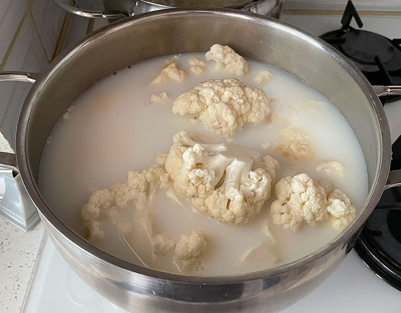 Karnabaharı çiçeklerine ayırıp yıkıyoruz. 1 adet patatesi soyup küp küp doğruyoruz. Bir tencereye 2 su bardağı su ve 1 çay bardağı süt koyuyoruz. İçine hazırladığımız karnabaharları ve patatesleri atıyoruz. Kaynadıktan sonra ocağın altını kısıyoruz ve kısık ateşte pişmeye bırakıyoruz.