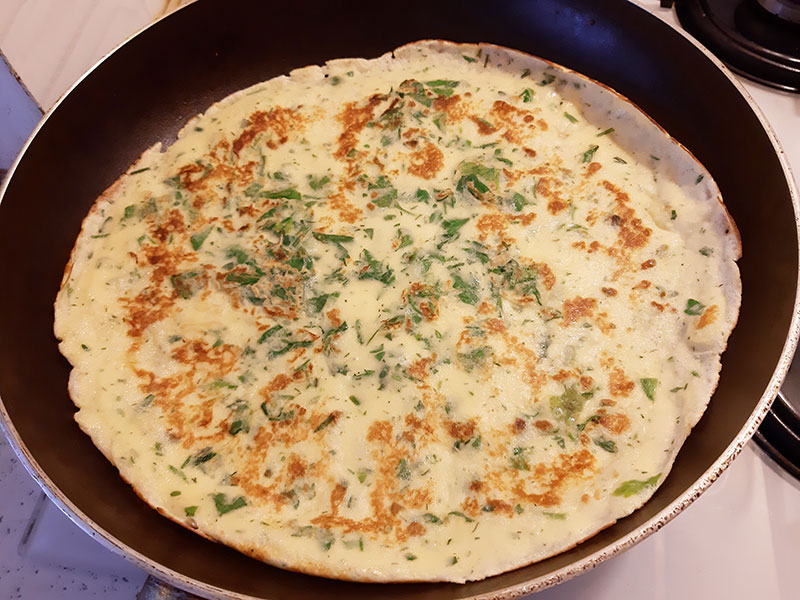 Bir kapta 4 adet yumurtayı çırpıcı yardımıyla çırpıyoruz. Üzerine 1 su bardağı un ve 1 su bardağı süt ilave ediyoruz ve iyice çırpıcı yardımıyla onları da çırpıyoruz. Üzerine 1 avuç ince ince doğranmış maydanoz, 2 dal ince ince doğranmış taze soğan ve 1 avuç ince ince doğranmış dereotunu da ekleyip güzelce kaşık yardımıyla karıştırıyoruz. Üzerine 1 yemek kaşığı kadar sıvı yağ ve 1 tatlı kaşığı tuz ekleyip harmanlıyoruz.