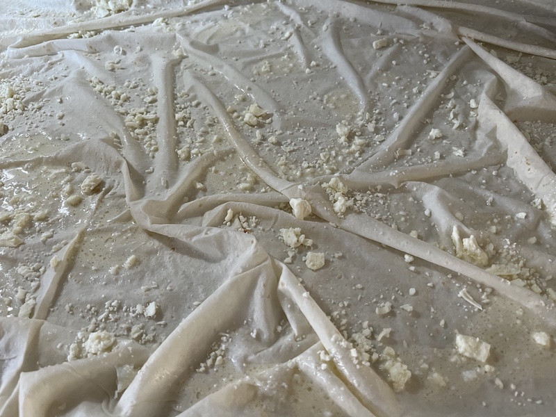 - Bir yufkayı tezgaha bütün halde açıp üzerine hazırladığımız sostan gezdiriyoruz. Hazırladığımız peynirden her yerine serpiyoruz.