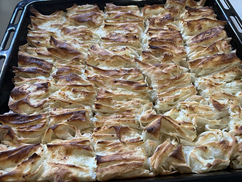 - Dilimlediğimiz yufkaları ve yağlanmış fırın tepsisine yerleştiriyoruz.