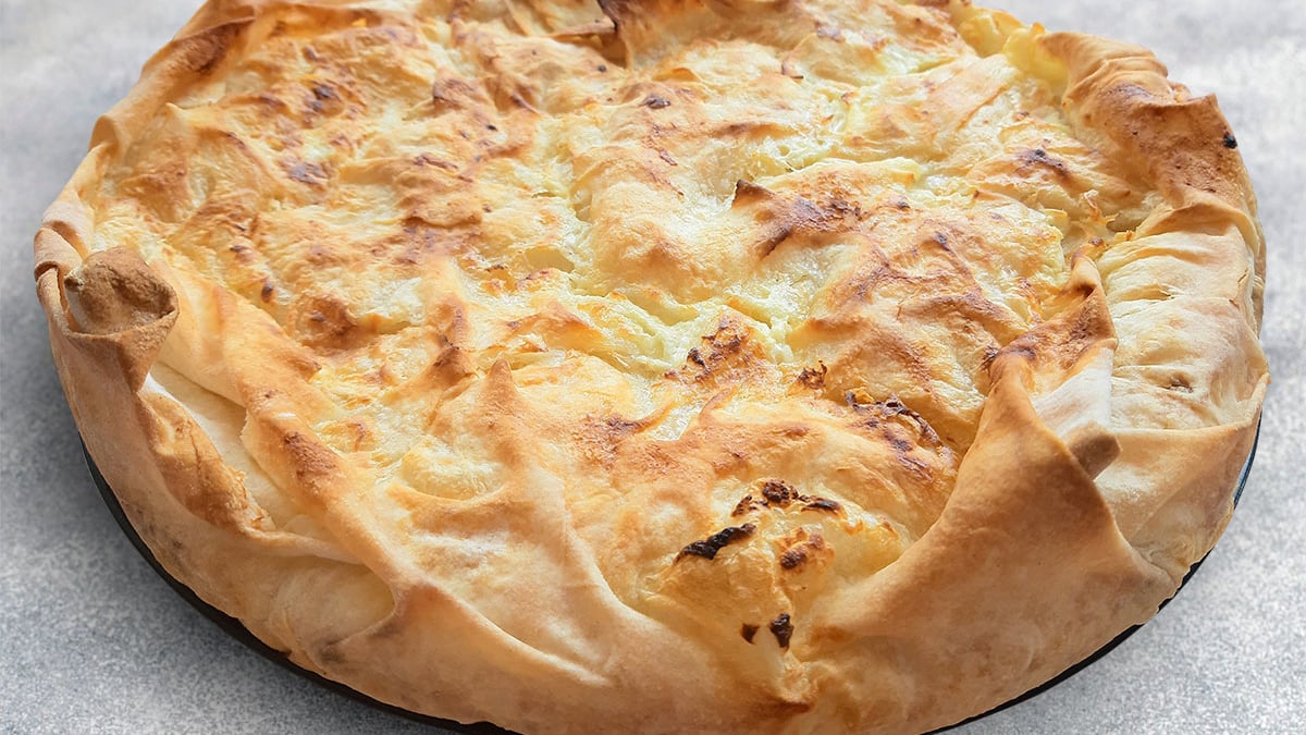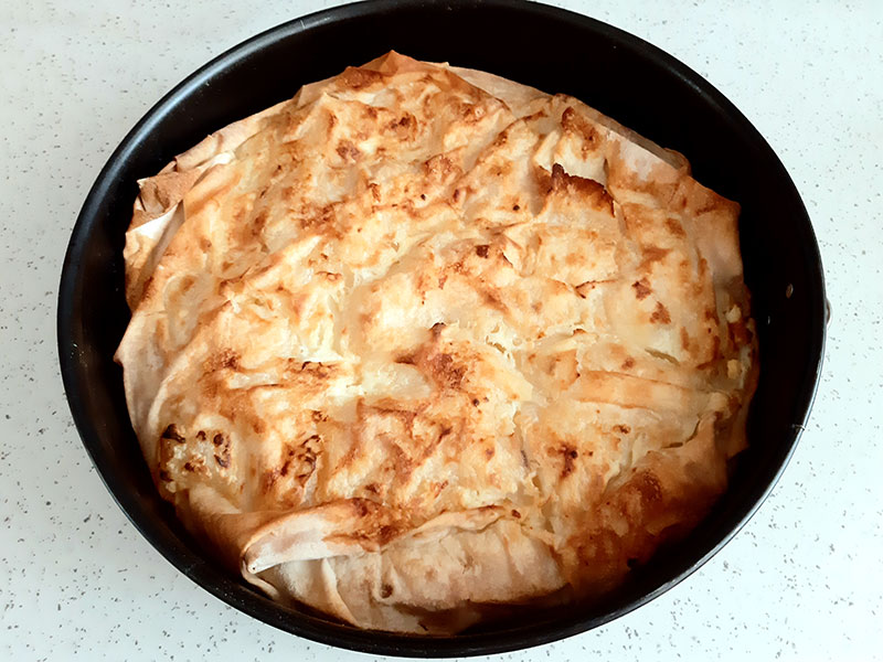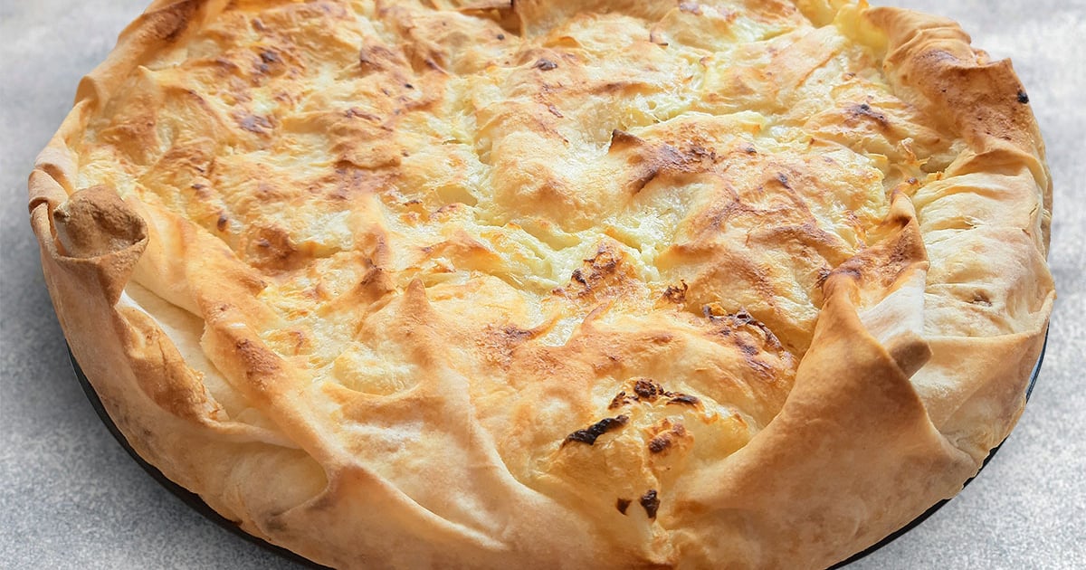 Derin bir kaba 2 adet yumurta kırıyoruz. Üzerine 1 su bardağından 2 parmak eksik süt ekliyoruz. Yarım su bardağı soda ve yarım çay bardağı sıvı yağ ilave ediyoruz. Tüm malzemeyi bir çırpıcı yardımıyla güzelce karıştırıyoruz. Hazırladığımız sosun içerisine 100 gram ufalanmış beyaz peynir ve 50 gram rendelenmiş kaşar peynir ekliyoruz. 3 adet yufkayı gelişigüzel şekilde kopartarak peynirli sos harcının içine ekliyoruz. Yufkalar sosu içine çekince yağladığımız yuvarlak fırın tepsisine bu harcı döküyoruz. Bir spatula yardımıyla üzerini düzelttikten sonra 200 derece fırında 40-45 dakika kadar pişiriyoruz.