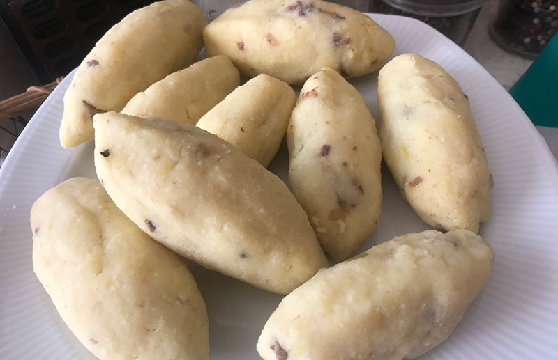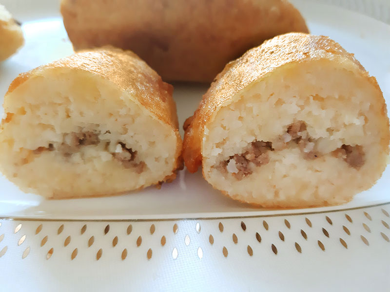 Hazırladığımız hamurundan mandalina büyüklüğünde parçalar koparıp, içlerine 1 tatlı kaşığı hazırladığımız kıymadan koyup içli köfte şekli veriyoruz. (Patateslerde açıklık ve çatlak kalmasın ki kızartma esnasında parçalanmasın) Tüm patatesli hamuru bu şekilde hazırlıyoruz.