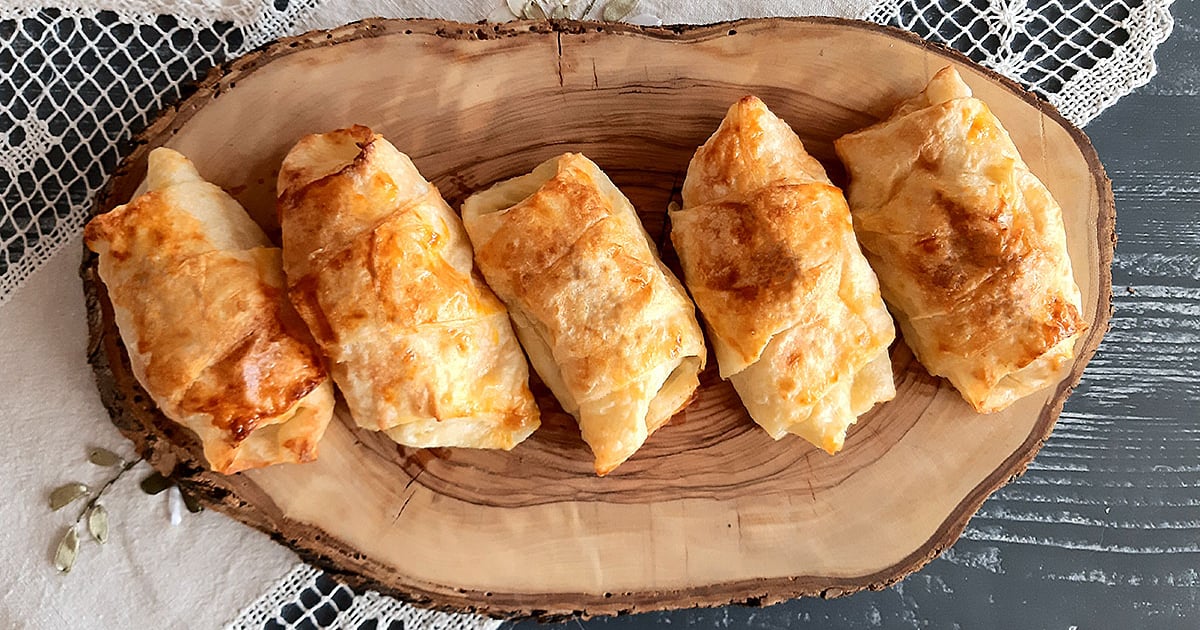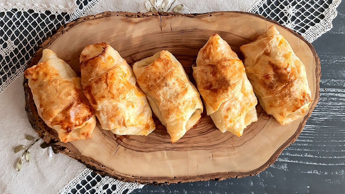 Tek tek üçgenlerin ortasına hazırladığımız kıymalı harçtan koyarak kenarlarını kıvırıp rulo şeklinde sarıyoruz ve yağlı kağıtlı tepsiye börekleri dizip üzerlerine 1 adet yumurta sarısı sürüyoruz. 200 derecelik fırında pişiriyoruz. Afiyet olsun…