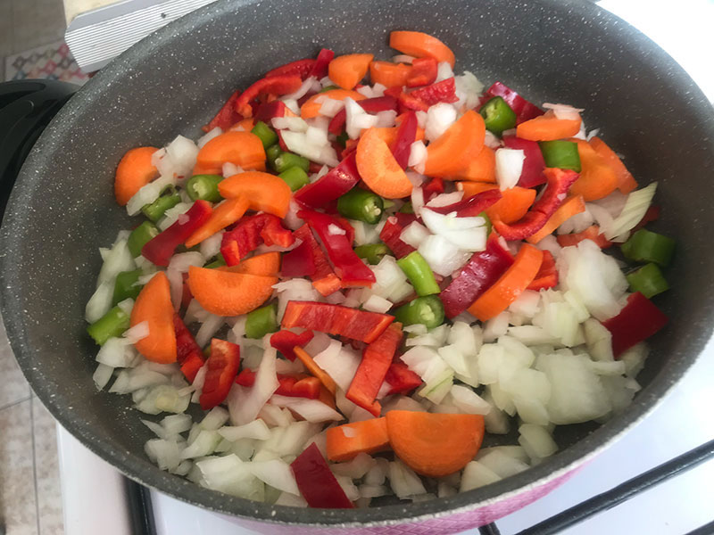 Bir tencereye 1 adet kuru soğanı yemeklik doğruyoruz. 3 adet yeşil sivri biberi yemeklik doğruyoruz. 1 adet havucu yarım ay şeklinde doğruyoruz. 2 adet kırmızı kapya biberi yemeklik doğruyoruz.