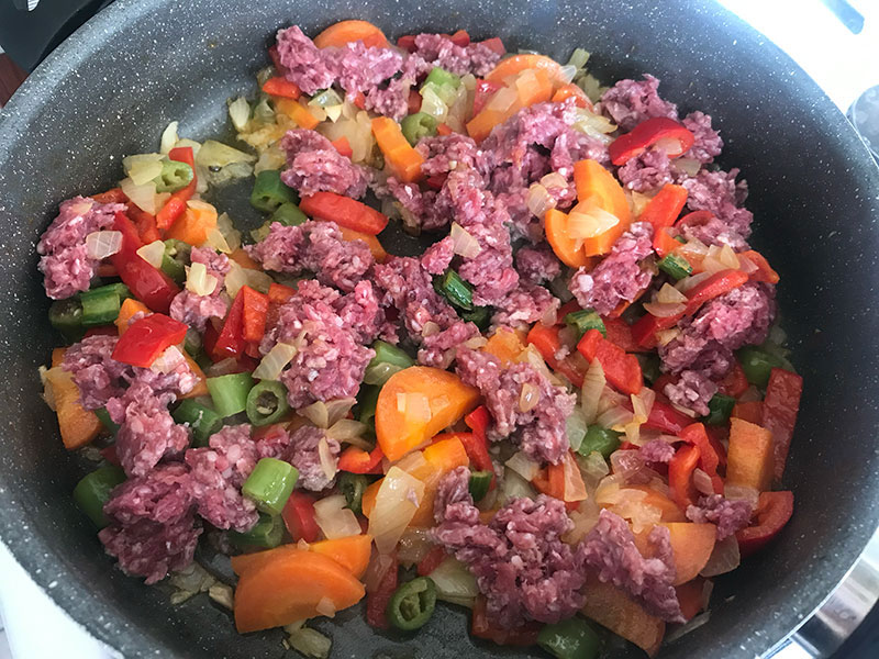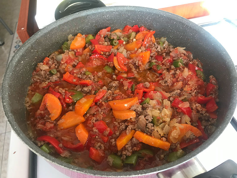 Hepsini yarım çay bardağı sıvı yağ ile kavuruyoruz. Üzerine 150 gram kıyma ilave ediyoruz ve onu da kavuruyoruz.